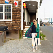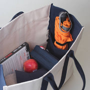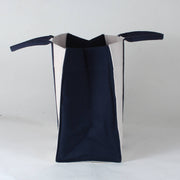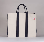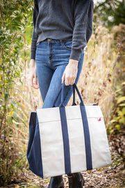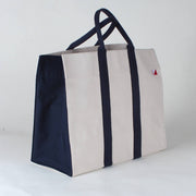 Large and loaded with style, take this bag everywhere you go. Heavyweight eco friendly cotton canvas. Two inside slip pockets on either end. Reinforced inside bottom in navy.