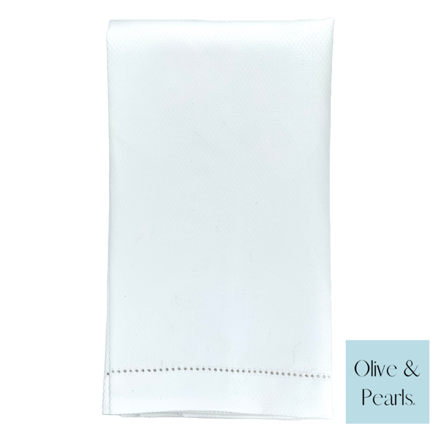 Our 100% cotton Huck Towel featuring hemstitching. The towel measures 17"x22" with a 1" wide end hem. There is a subtle diamond pattern to this absorbent and lent free towel.