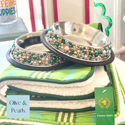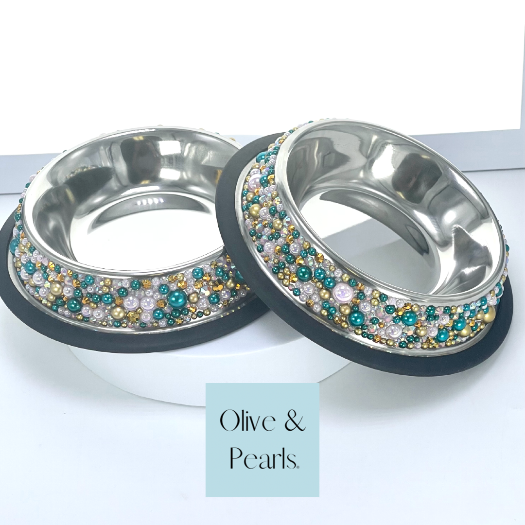 This stunning set of stainless steel, embellished pet bowls is ready to ship! Both bowls are slip resistant and tip resistant. Small in stature, but big in style, our Siren pearl and rhinestone mix will make you swoon!
