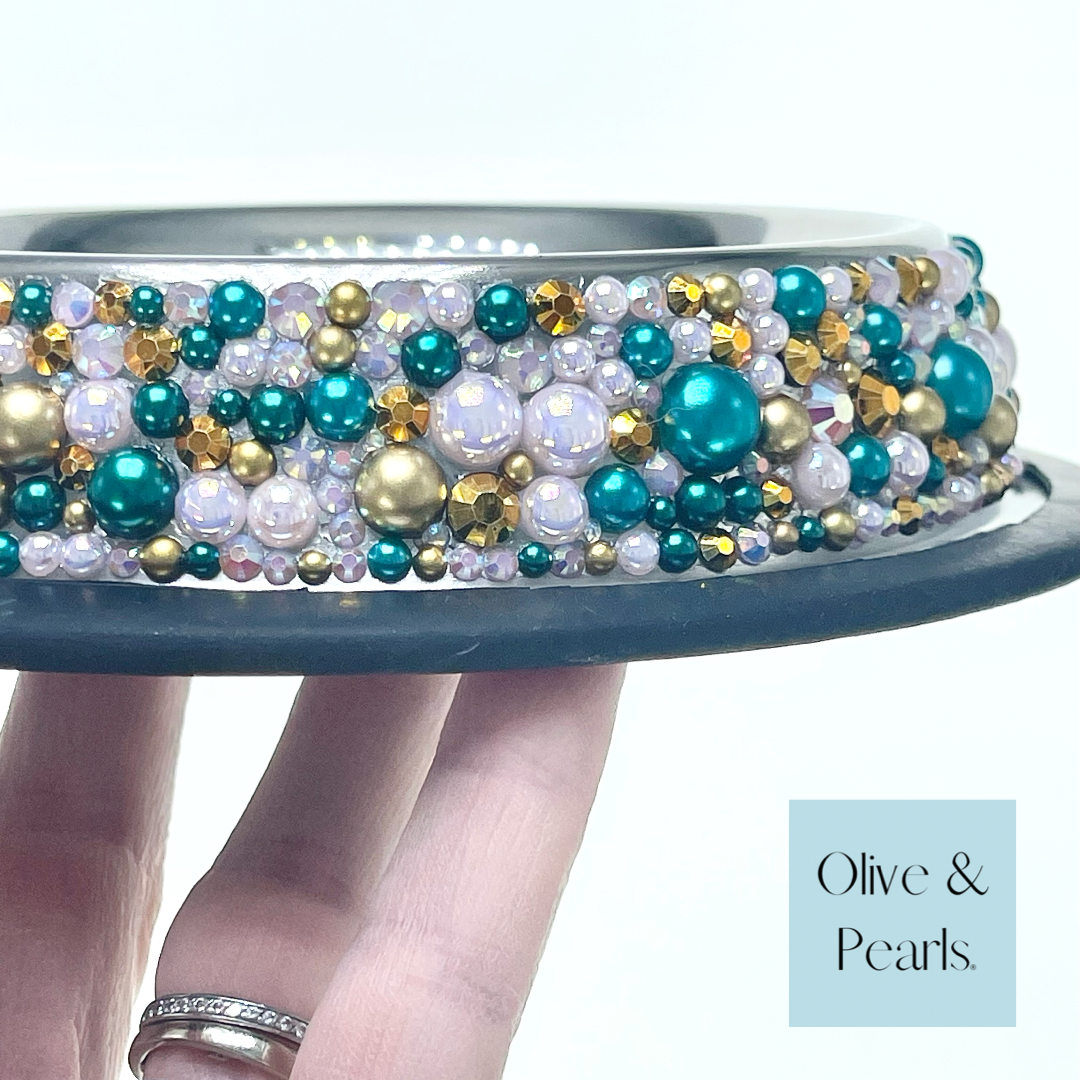 •Siren pearls and rhinestones feature deep green, light pink, gold, and iridescent colors