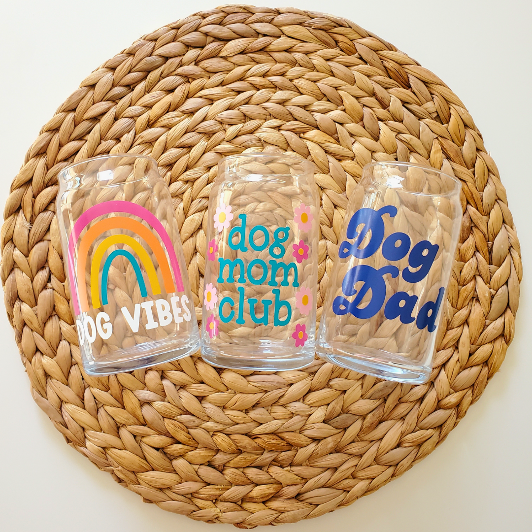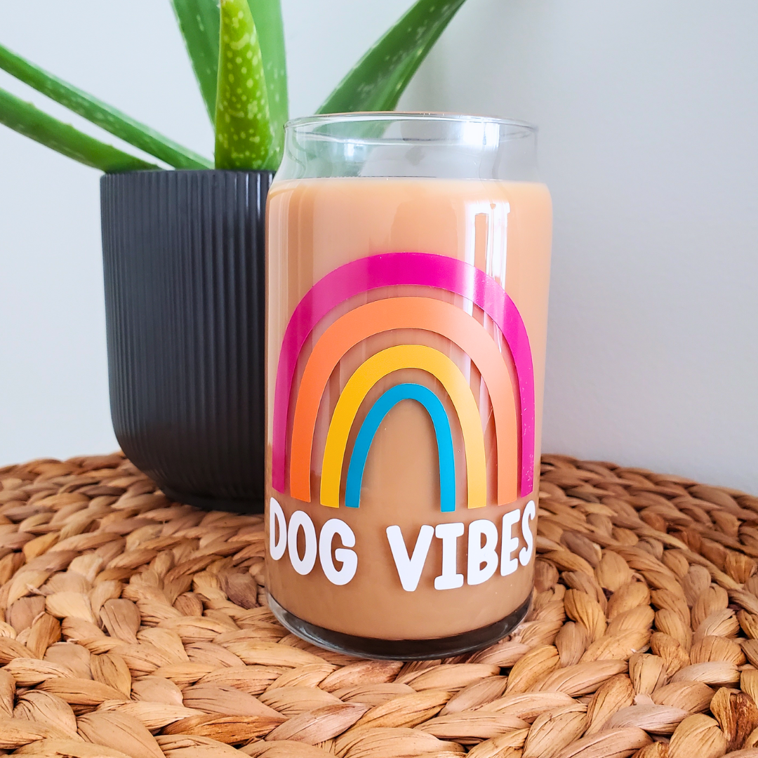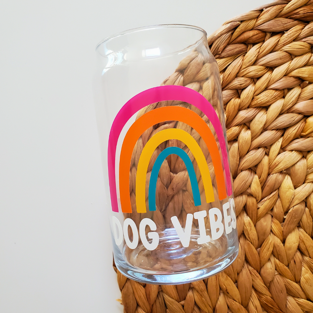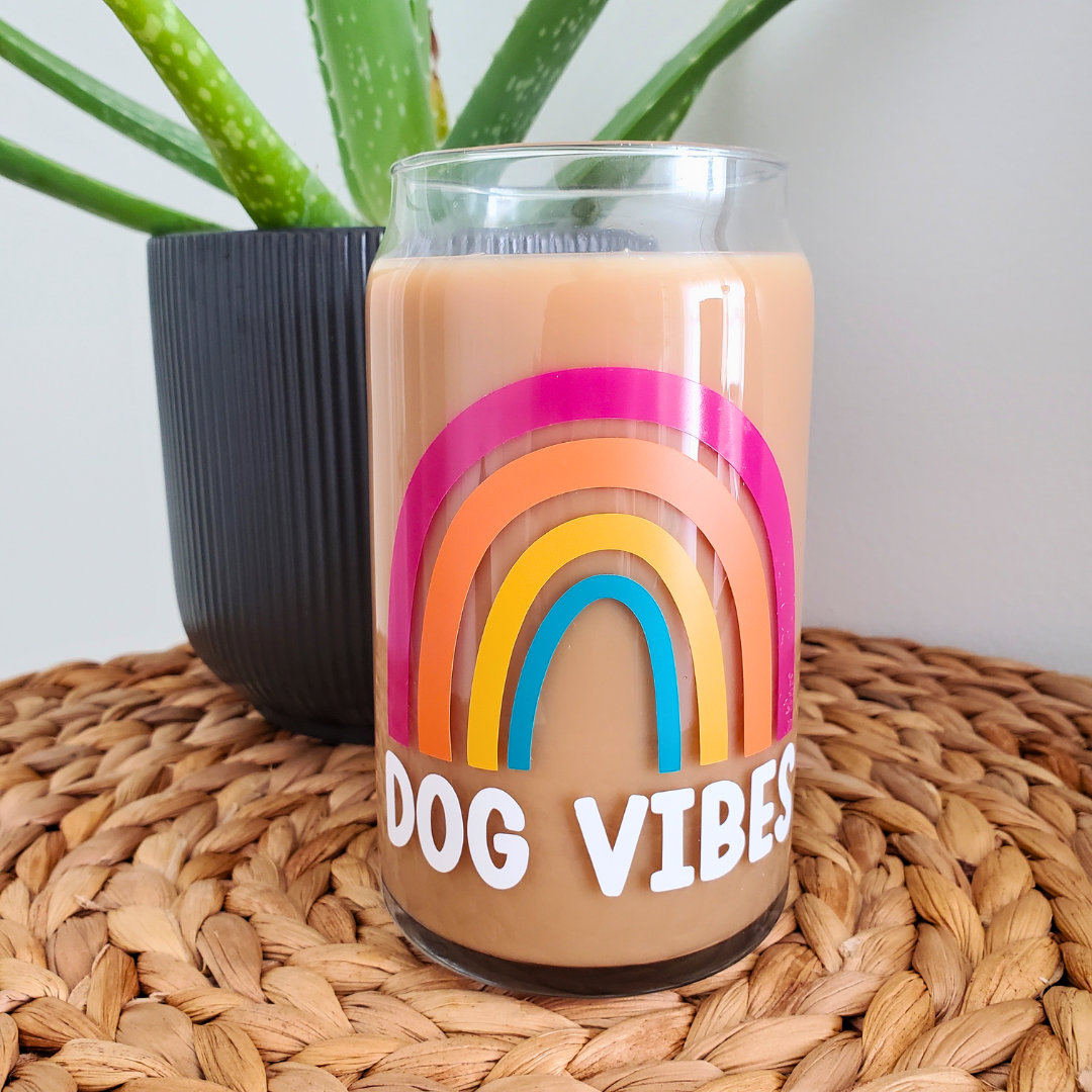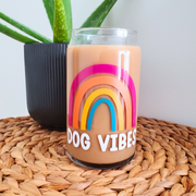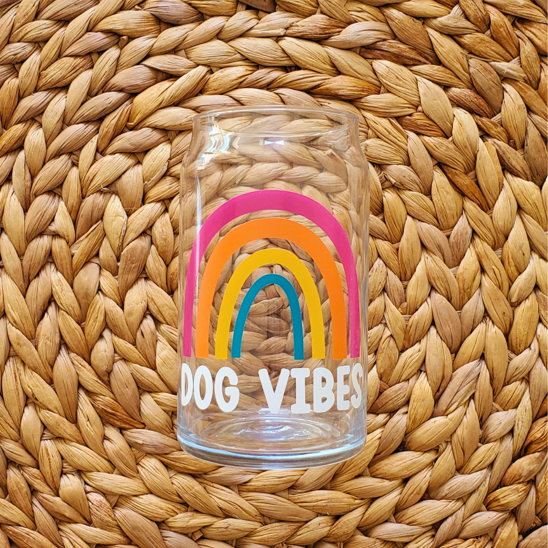 Show your love of dogs with the Dog Vibes 16 oz. beer can glass. Perfect for a cold beer, iced coffee or your favorite cold beverage! These glasses make the perfect gift for all the dog lovers in your life or a fun gift for yourself.