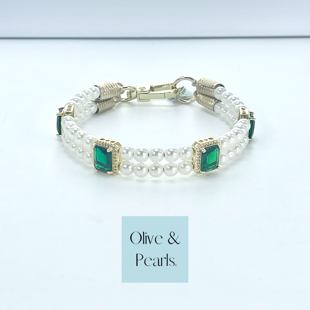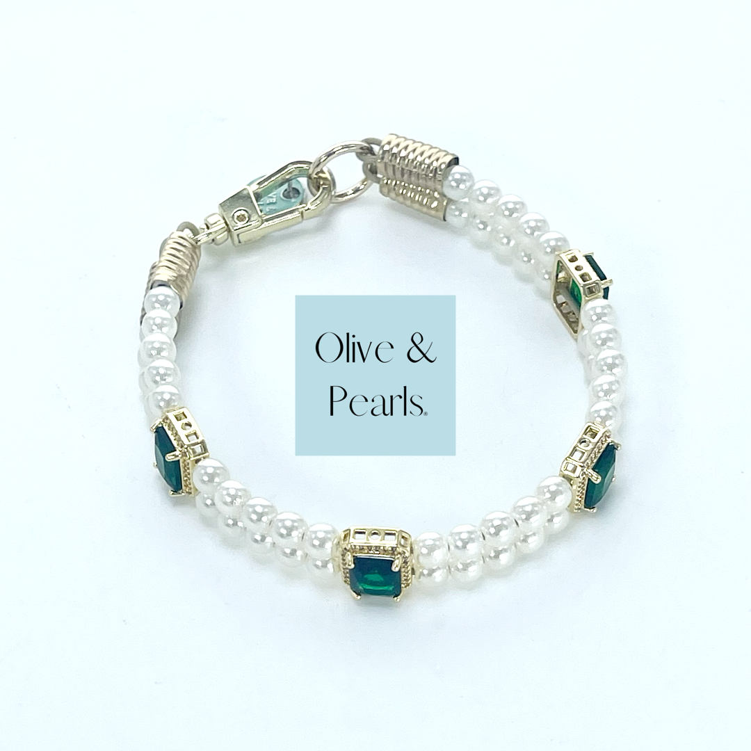Our “Abbigail” Pearl Dog Collar is the newest addition to our Extra Collection. This stunning two strand collar features your choice of ivory or white pearls and evenly spaced emerald-colored stones. The stones are surrounded by rhinestones and set in a gold-colored setting. The end result is a classic and sophisticated piece of jewelry. And sorry guys, this one is only for the smaller pups!