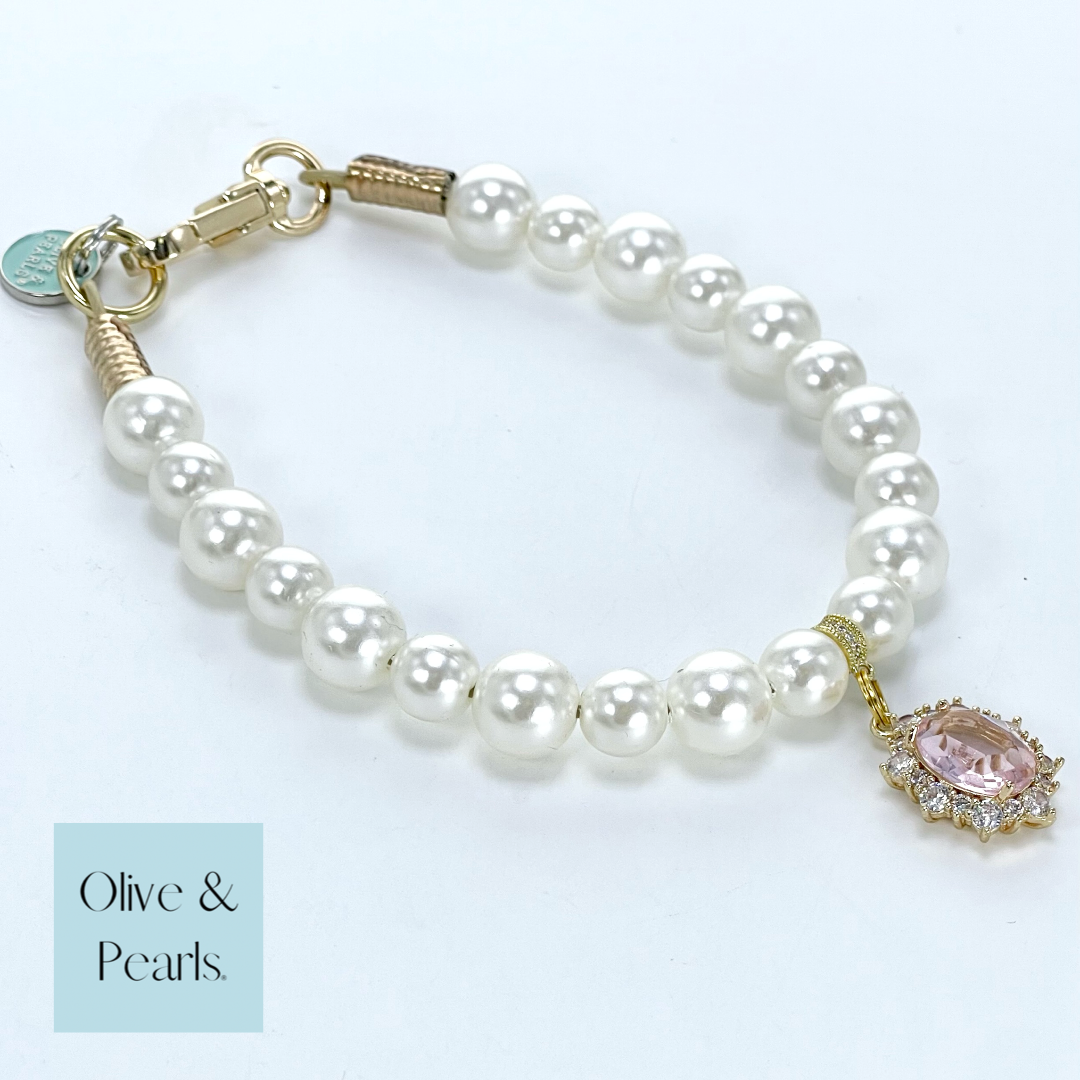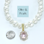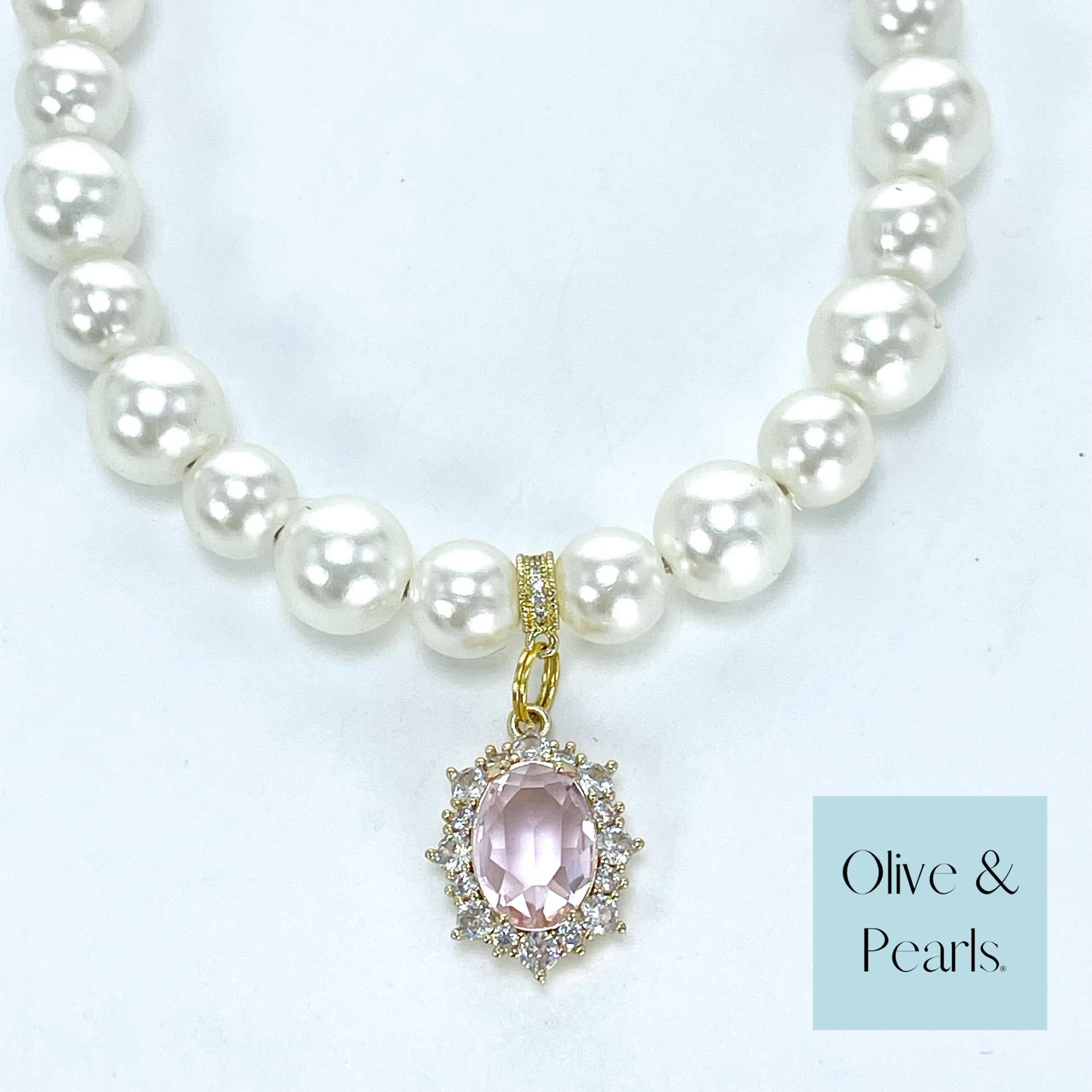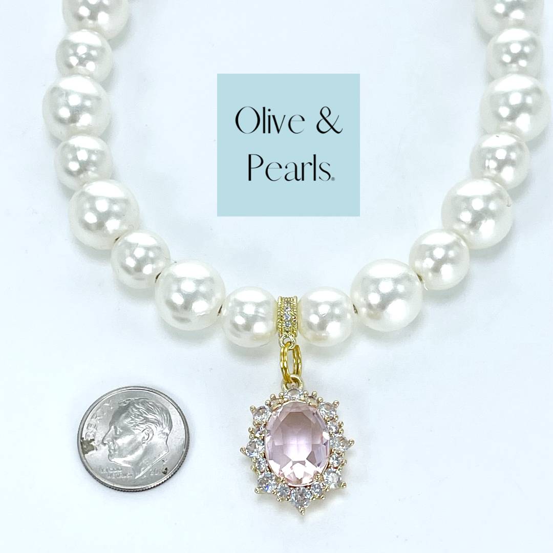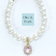 The “Annabelle” Pearl Dog Collar is a statement in refined elegance. This collar’s pearls are ivory and alternate from 10mm to 12mm in size. The necklace is centered with a stunning rhinestone encrusted pendant set in a gold-tone setting. We offer the pendant in three colors: light pink, light purple, and green.