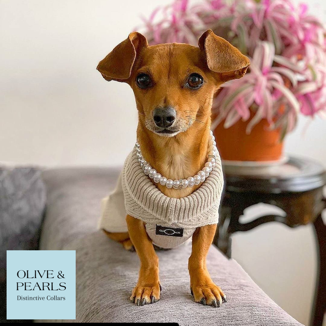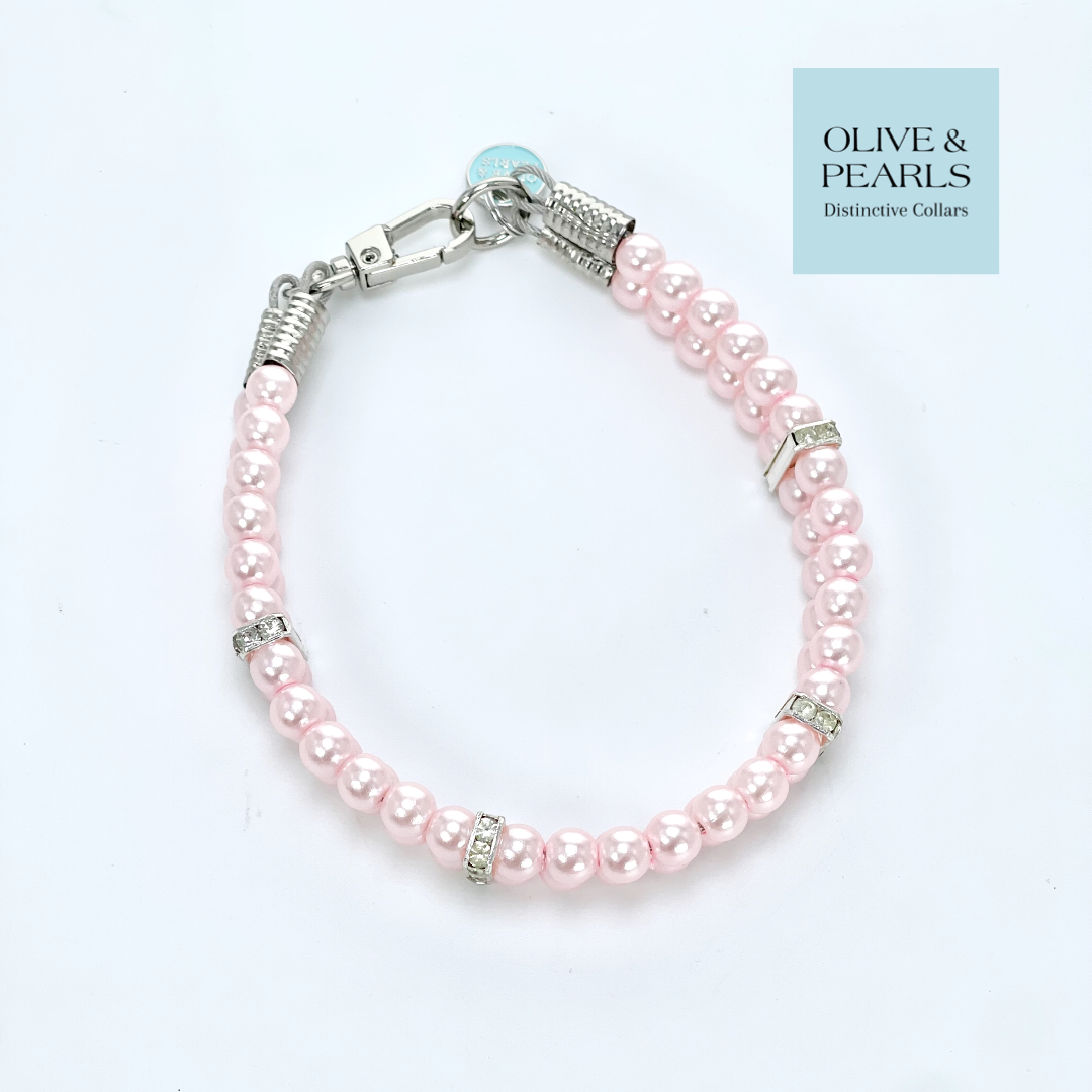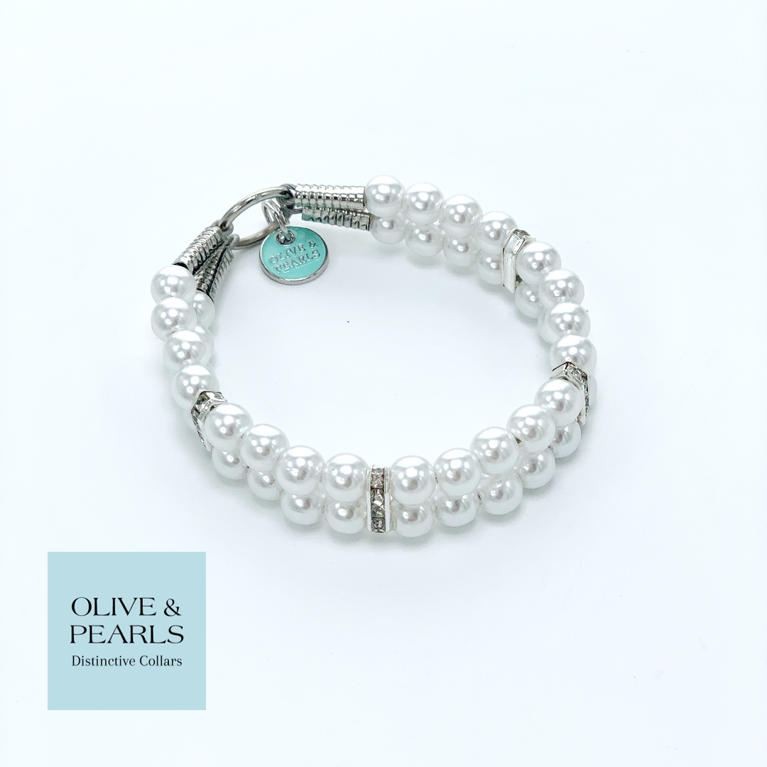 The "Poppy" Pearl Dog Collar, Jeweled Dog Collar is a statement in elegance. Designed with the smaller pups in mind, this collar is only 16mm in height, but still boasts the same strength as our regular sized collars! Two rows of small pearls are beautifully joined together with evenly spaced rhinestone spacer bars. This collar is lightweight and easy to maneuver on and off. It is also leash appropriate and oh so stylish!