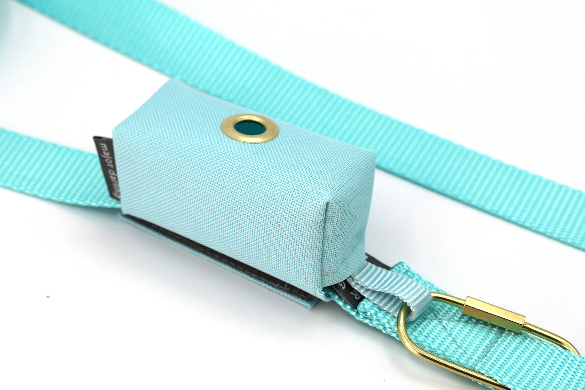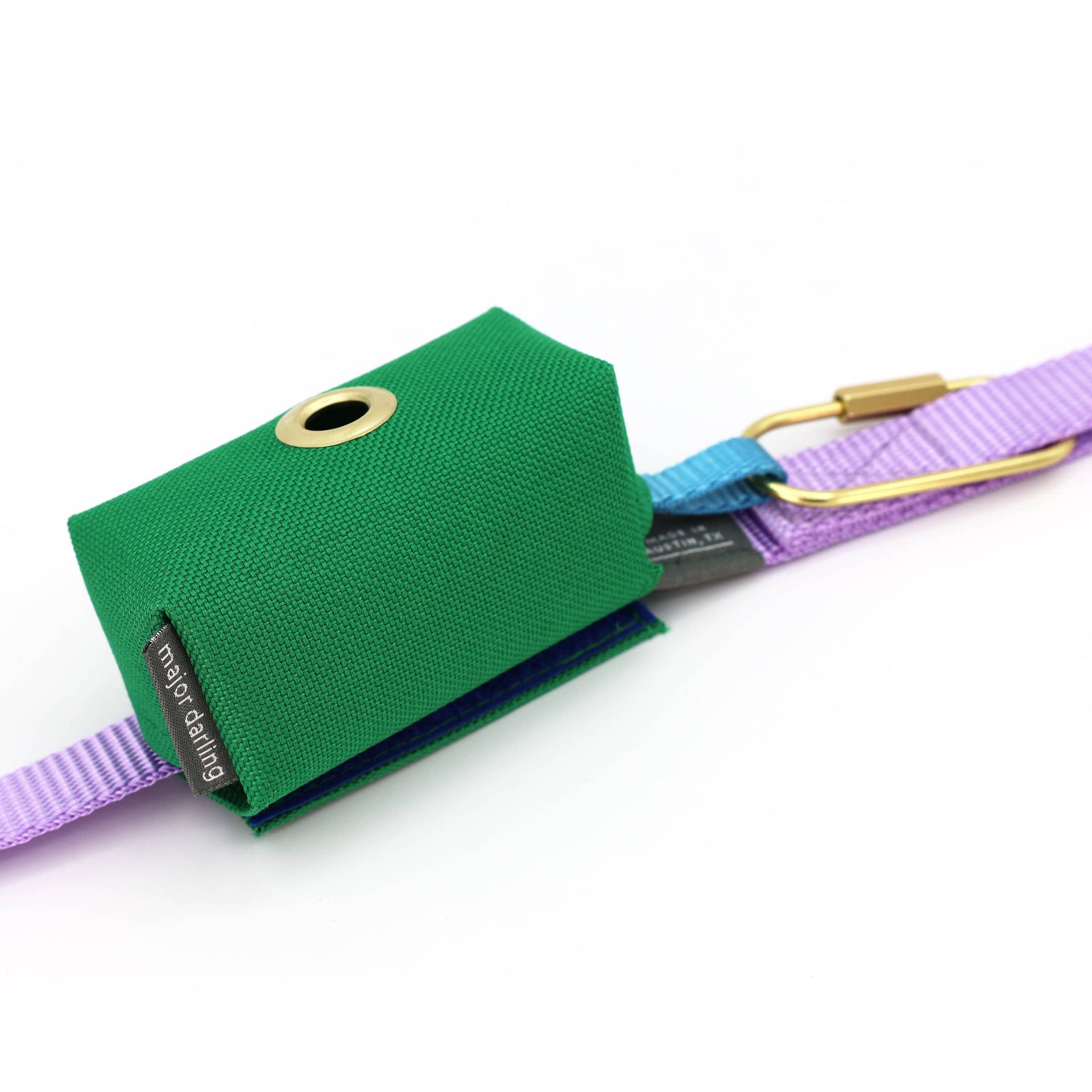 Major Darling's dangle-free poop bag holders are here! Made from durable and weatherproof Otter Tex canvas with contrast Velcro, they wrap around your leash to stay out of the way. The brass attachment can hook onto the handle of the leash so that your bags stay put – or the attachment can be tucked inside or removed.