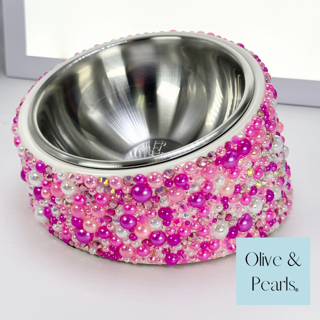 Elevate your pet's dining experience with this stunning slanted feeder bowl in luxurious bubblegum pink, embellished with gleaming crystals and pearls. The thoughtfully designed piece features a removable stainless-steel bowl that integrates seamlessly into the base. A sparkling addition to any home, this feeder transforms mealtime into an occasion fit for any pink princess!