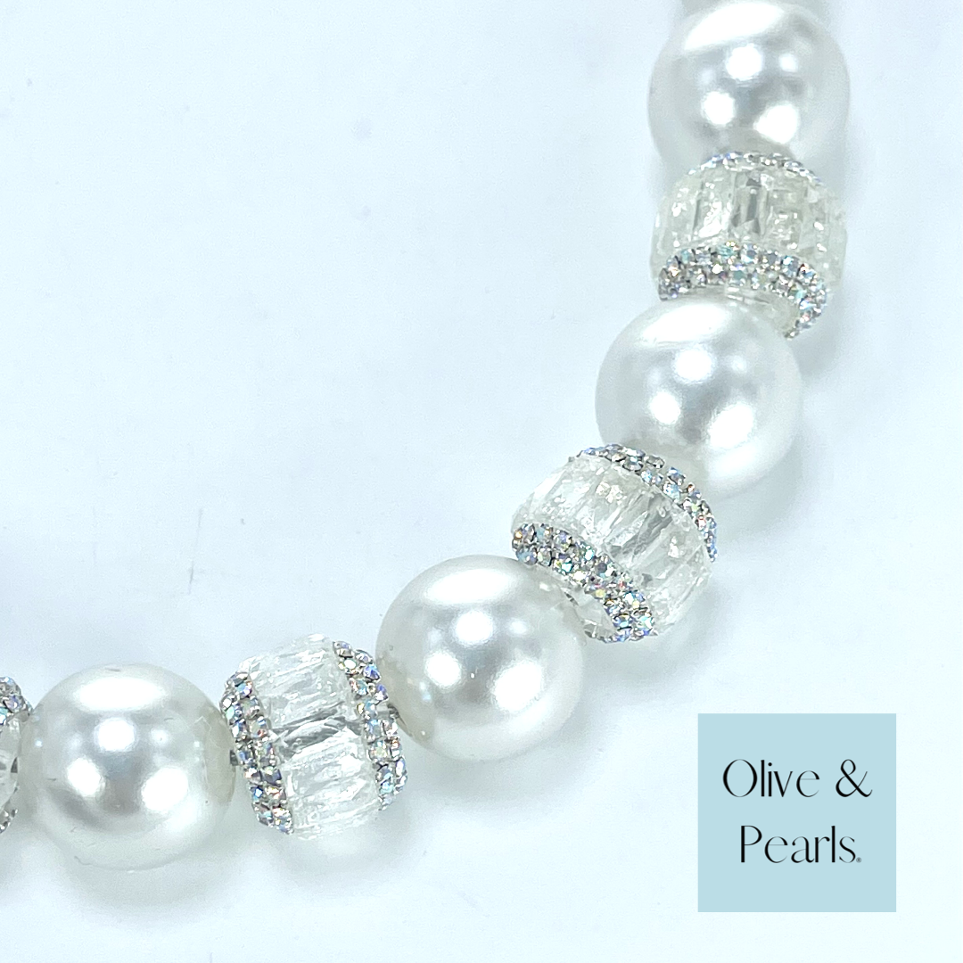 This single strand collar is similar to our Babe collar, except that it features pearls decreasing in size as the collar goes outward. In the center of the collar there are crystal colored barrel beads that are edged in rhinestones. This collar is a refined choice for those looking to add some extravagance. This collar is Ready To Ship. This is the actual collar you will receive. This collar ships next business day.