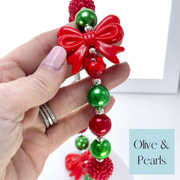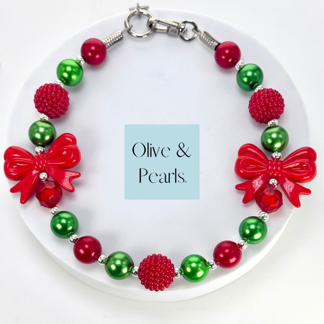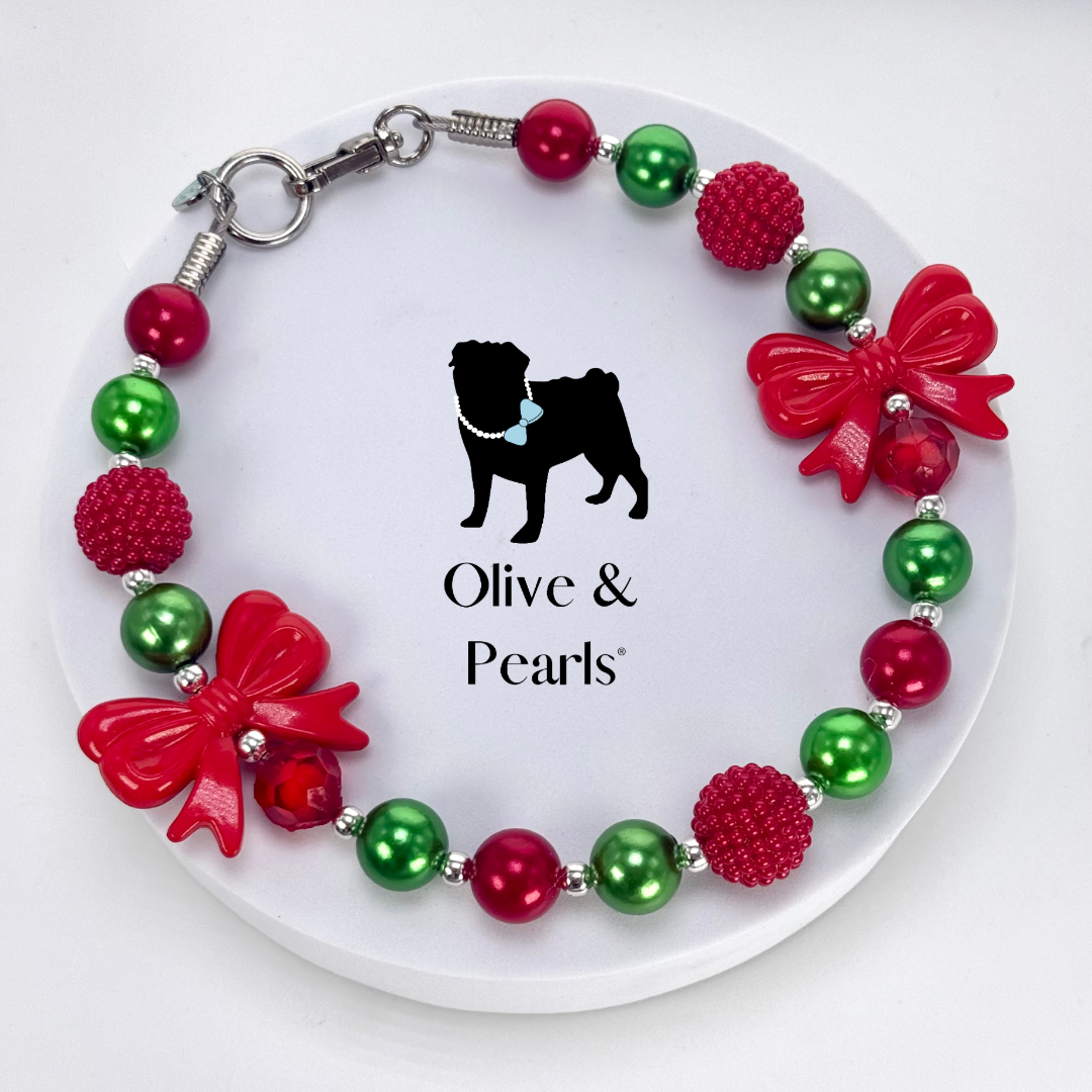 Show off your pup’s festive cheer with our “Emmy Lou” Christmas Pearl Dog Collar! Adorable red bows accentuate this joyous collar, making this one of the cutest collars yet! Make some smiles this holiday season with your pup showing off their “Emmy Lou” pearl collar!