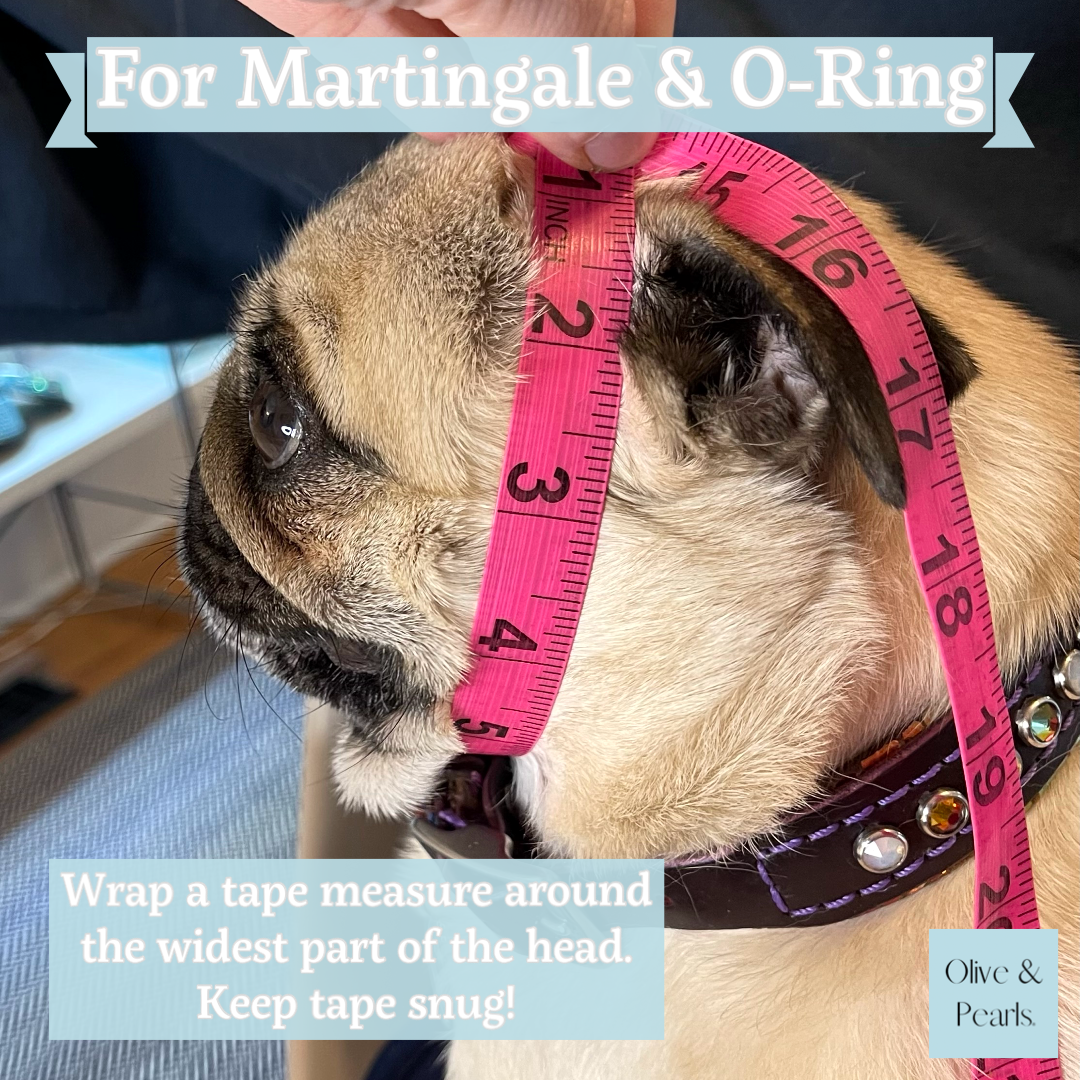 -To measure for MARTINGALE and "O" Ring Hardware collars, measure around the widest part of the head, keeping the tape snug.