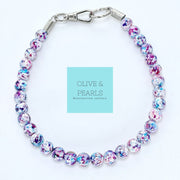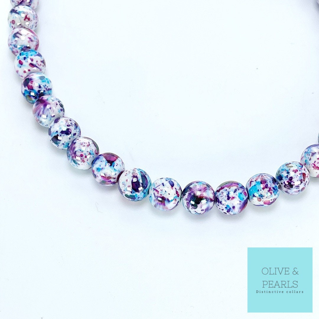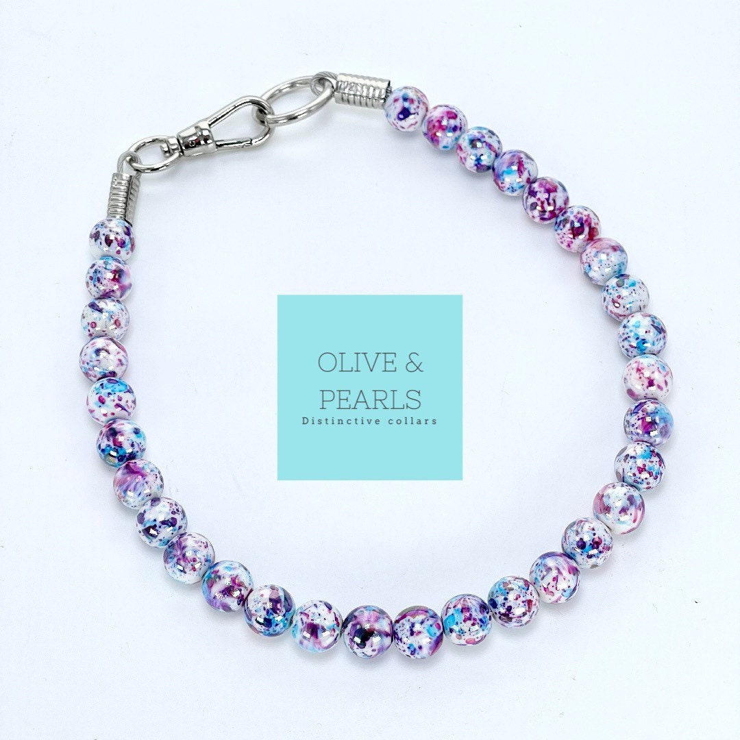 The “Iris” Beaded Dog Collar is a fun and upbeat addition to every dog’s style! This single strand collar features splatter painted, white beads in bright purple and blue hues. The beads measure 12mm, making this collar a great choice for all pups big and small! And don’t forget, this collar is as strong as it is beautiful!