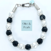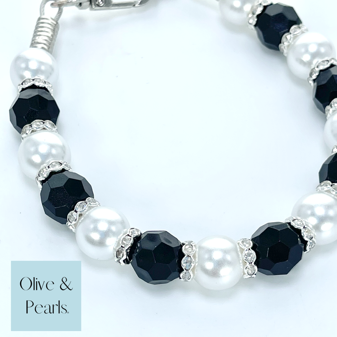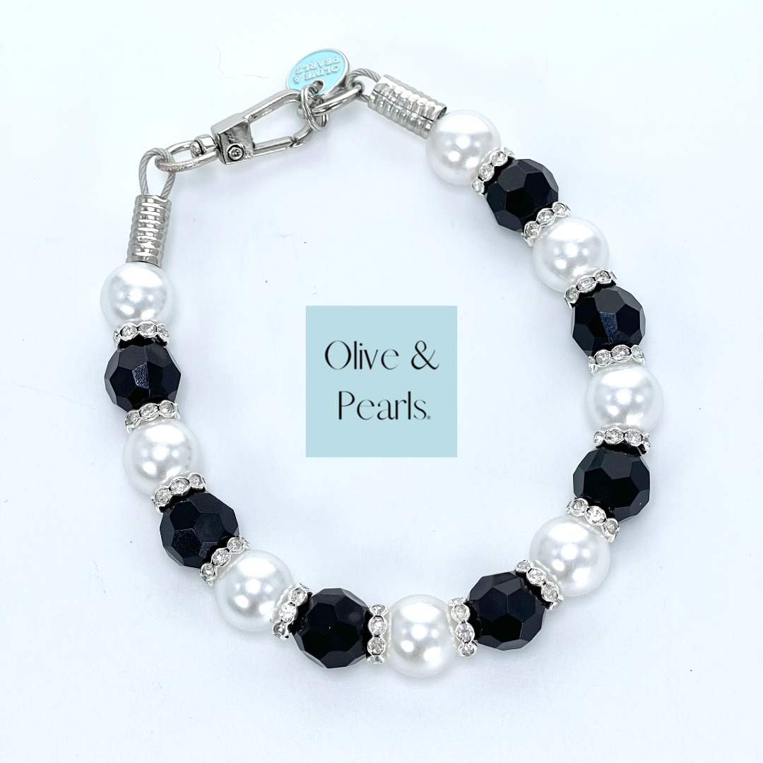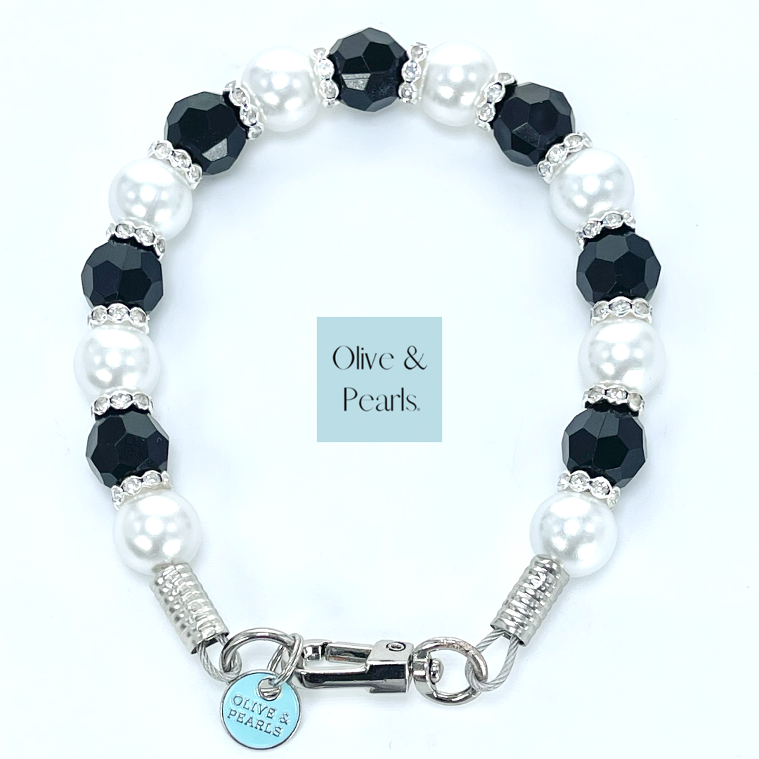 Our new "Julia" Collar is a statement in classic elegance. A perfect, single strand collar designed with classic style and sophistication, every dog will be elevated by adorning this piece. Medium sized white pearls are paired with faceted black beads and rhinestone spacers. This collar is a timeless classic already!