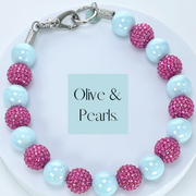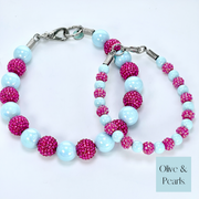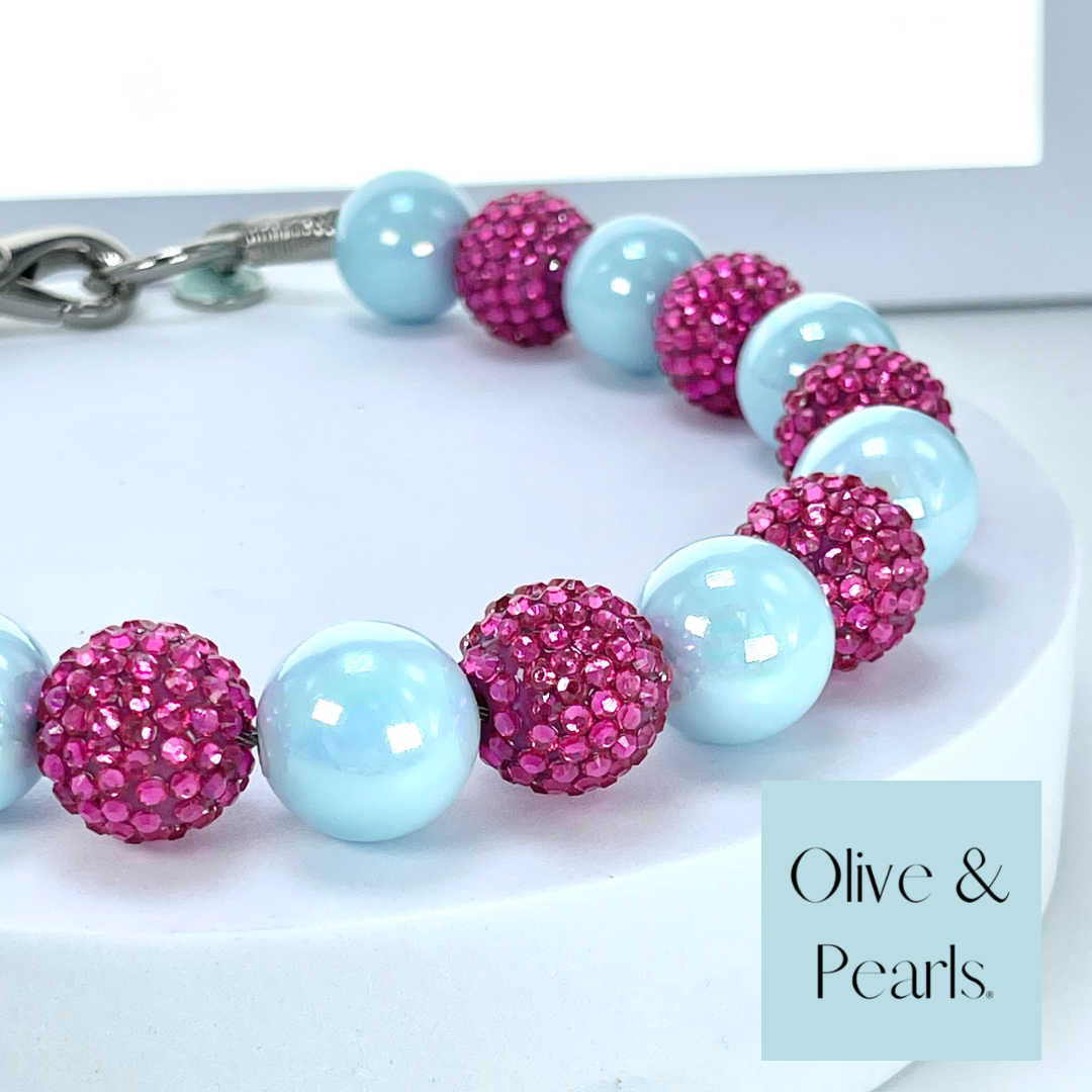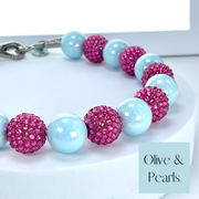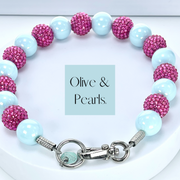 The “Maran” collar is a new offering in our single strand collars. It features large, solid colored, acrylic beads coated with an AB topcoat. We paired a beautiful, sky-blue bead with a bright, raspberry pink, rhinestone bead and it just can’t get any cuter! In fact, we love it so much, we even made a mini version!
