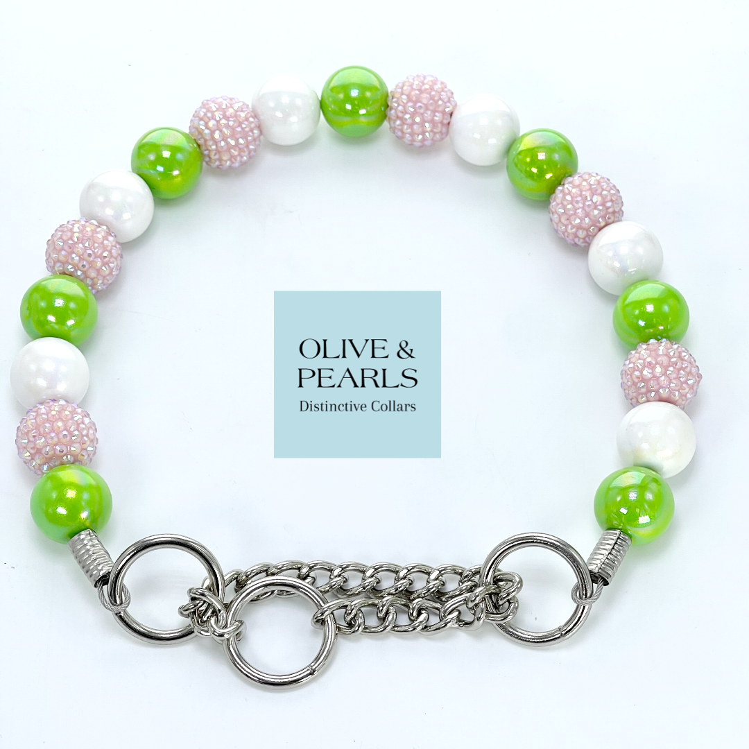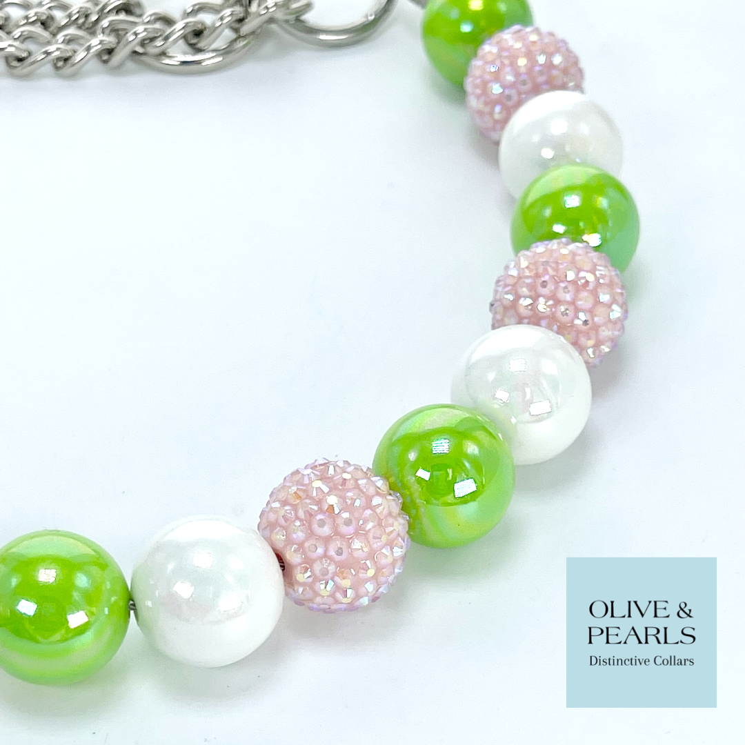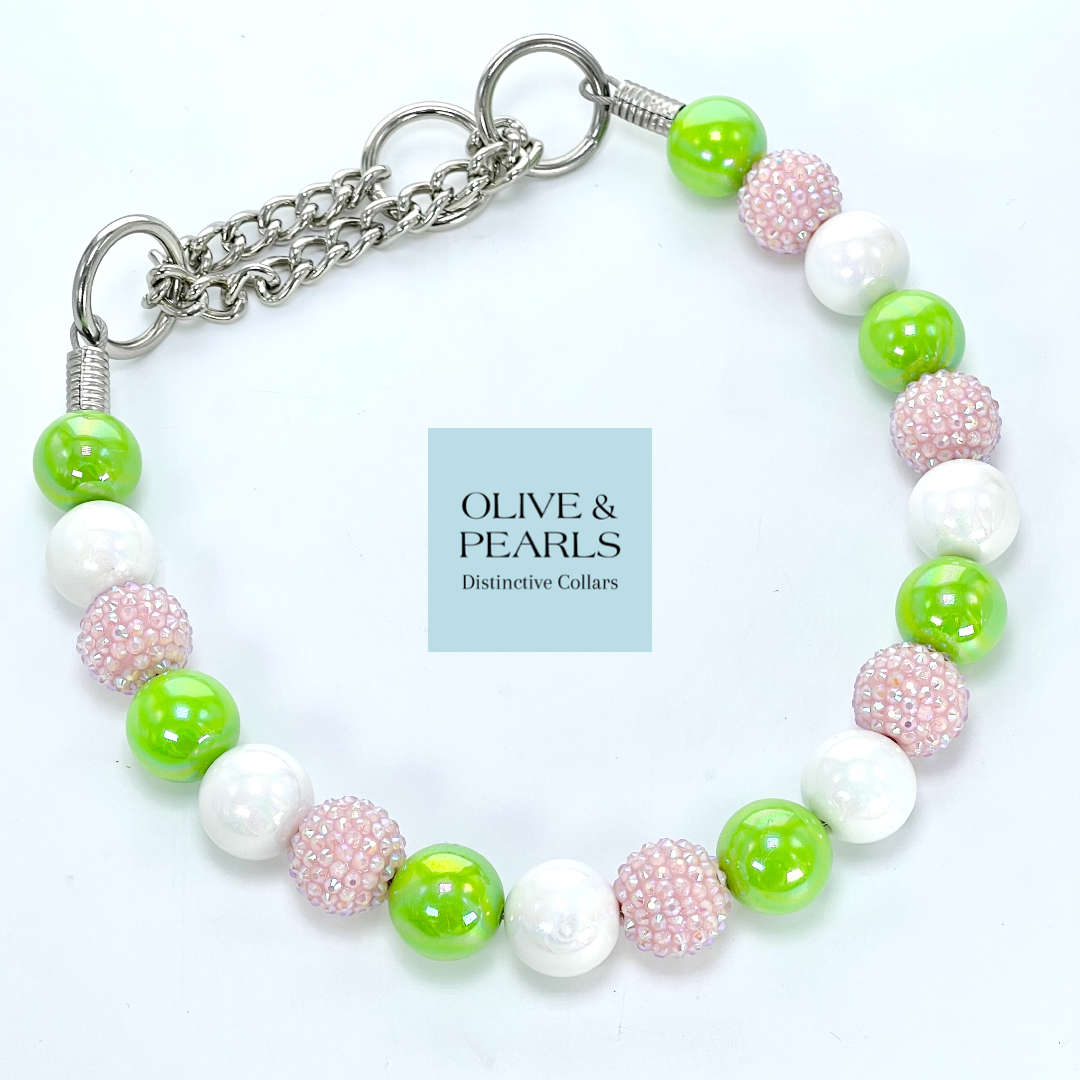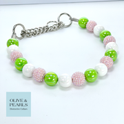 Our "Stella" collar is sure to bring Spring time vibes to you and your pup! This single strand, beaded collar features pink rhinestone beads, along with vibrant lime and crisp, white, resin beads. A Palm Beach staple, this fun collar is perfect for any outing where there is plenty of sunshine!
