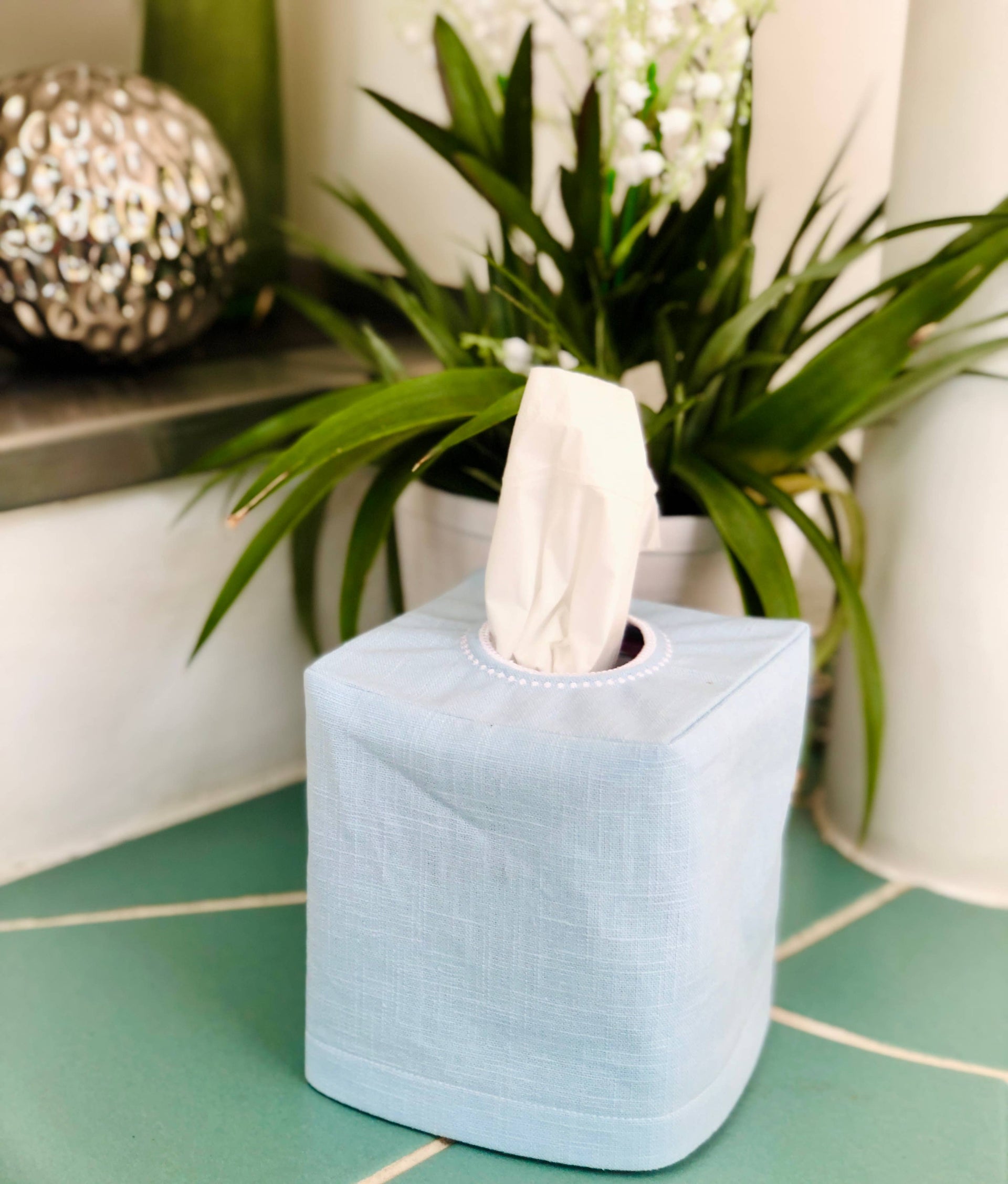 Light Blue Linen Tissue Box Cover with Applique Monogram