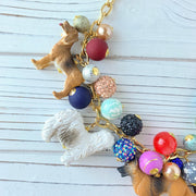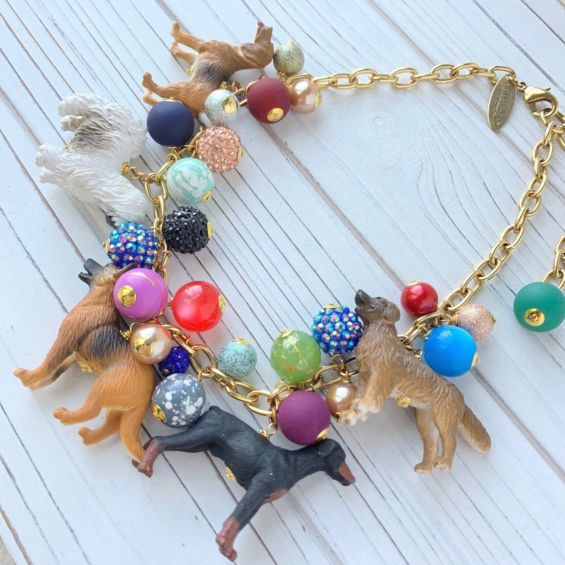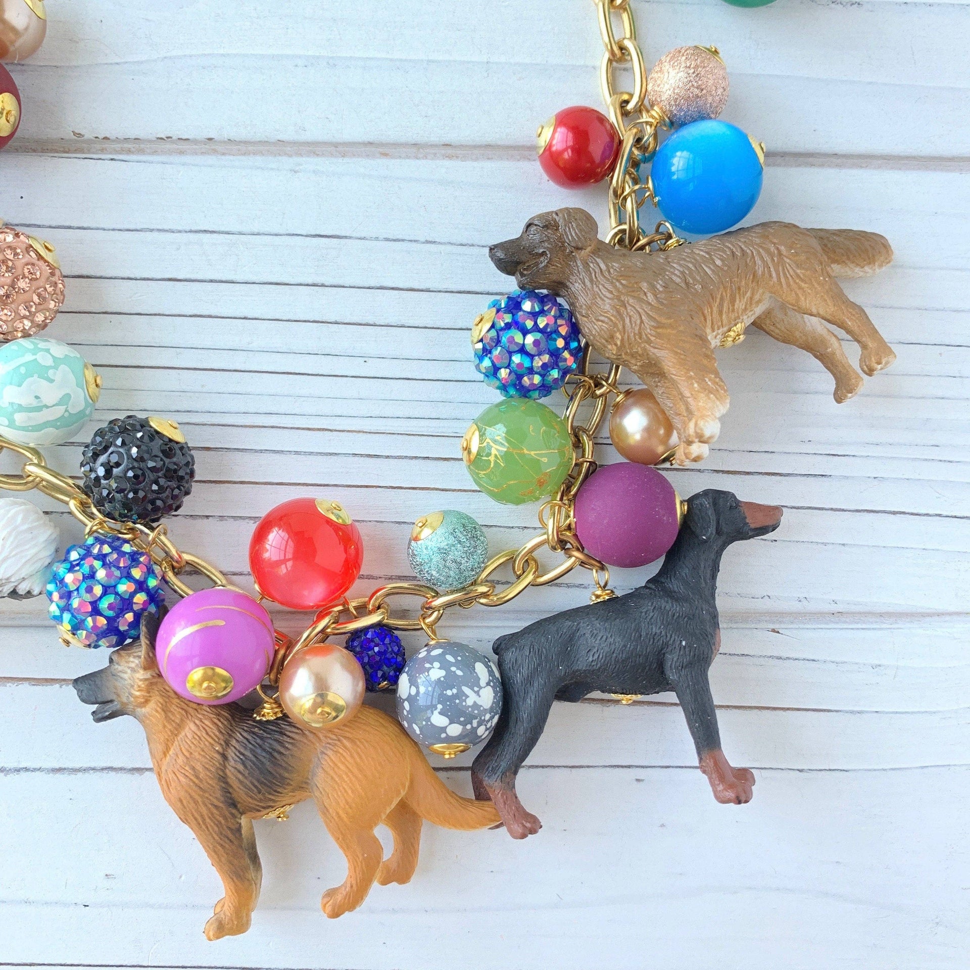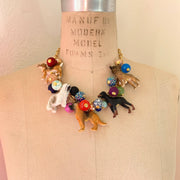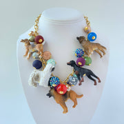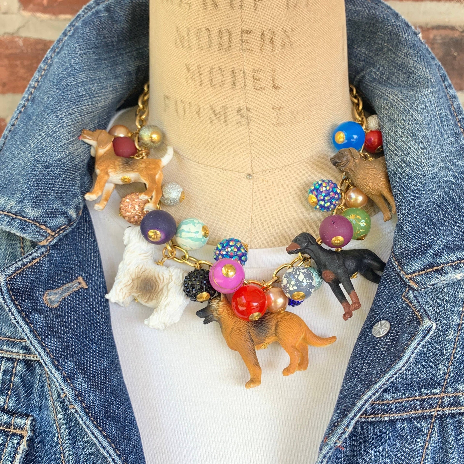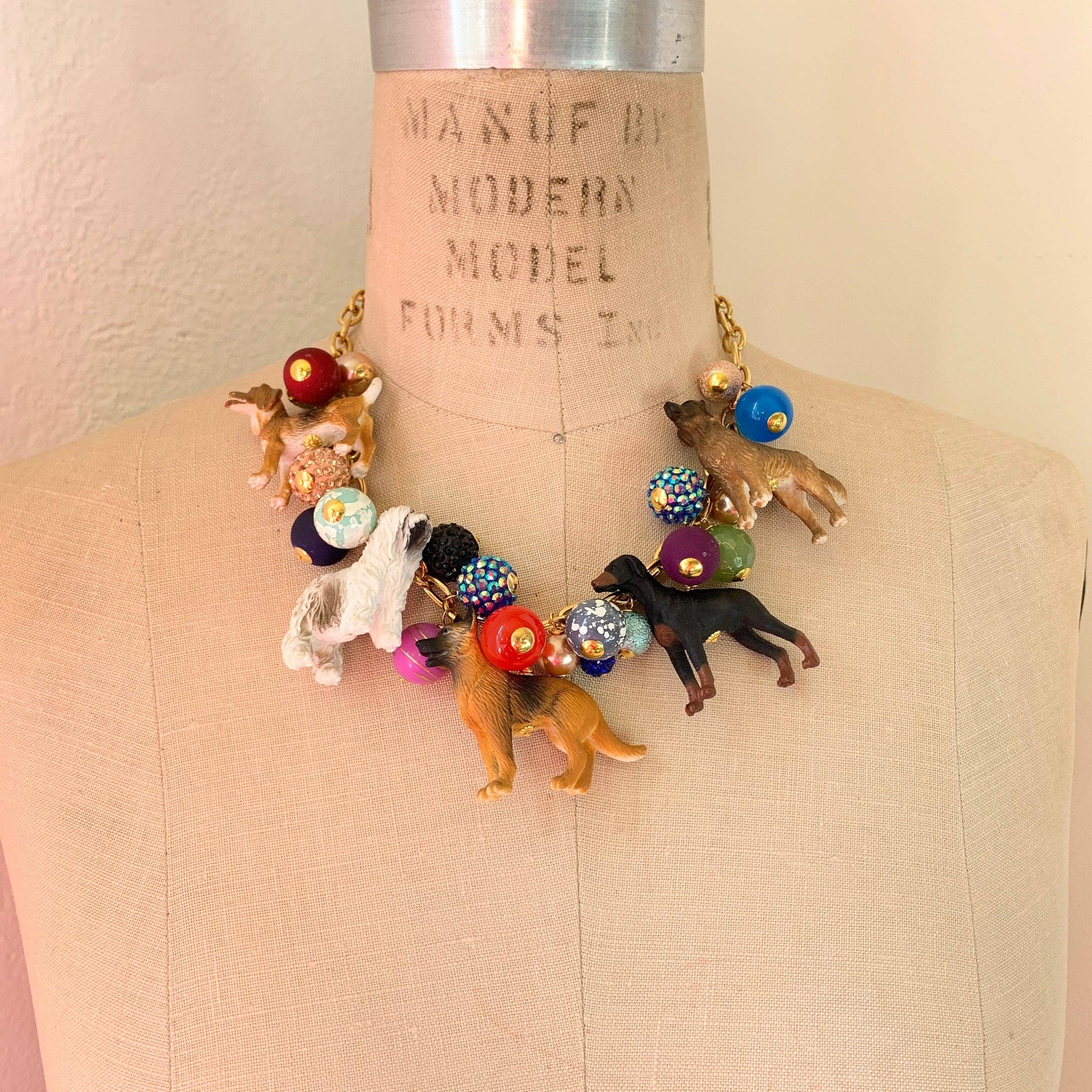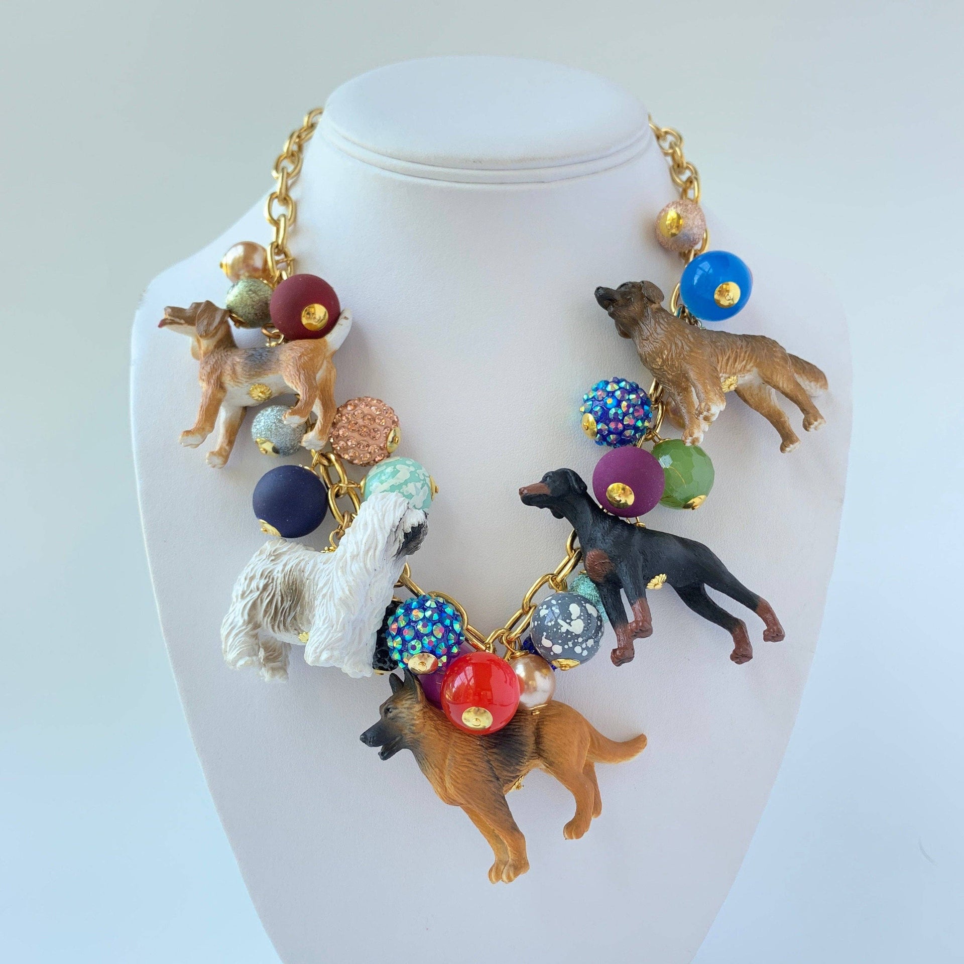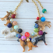Dog lover's statement necklace with a playful assortment of mini toy dogs and colorful beads. This colorful bauble necklace sure makes a statement and that statement says, "I Love Dogs"! As one of our best sellers, this makes the perfect dog lover gift, or a gift for the dog trainer, your dog groomer, dog walker. If you haven't already then you definitely need to add this piece to your Lenora Dame merchandise selection.